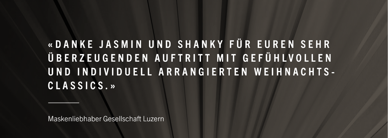 Ich bin Jasmin, mit Leib und Seele Sängerin. Bereits als kleines Mädchen stand ich liebend gerne auf grossen Bühnen. In der Zwischenzeit kann man mich in verschiedensten Konstellationen erleben ob zum gediegenen Anlass oder zur ausgelassenen Party. Meine warme Powerstimme begeistert und berührt Alt und Jung.